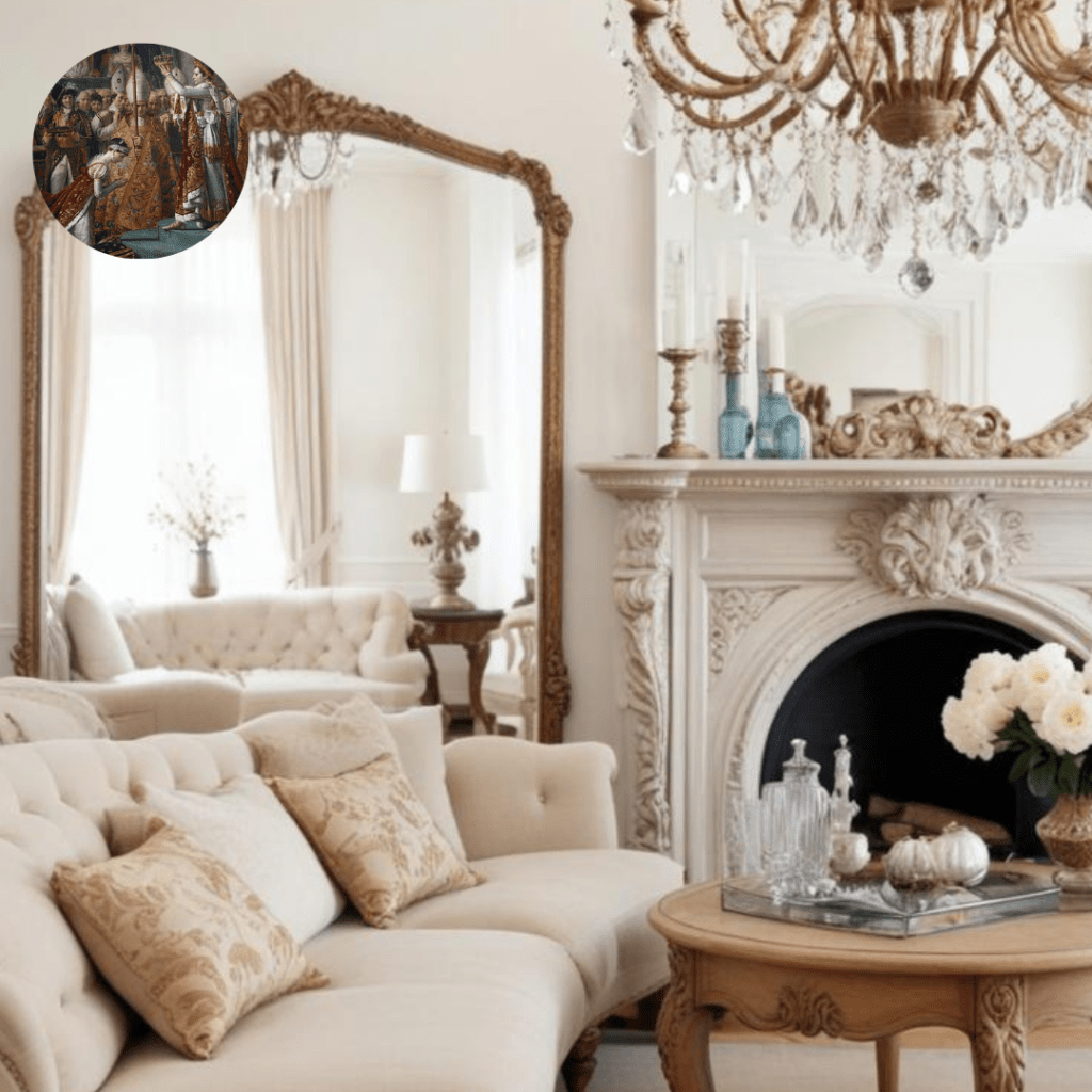 Napoleon and Joséphine’s love story was as opulent as it was passionate. A French-inspired interior with tufted furniture, a gilded mirror, and a dazzling crystal chandelier embodies their grandeur. Picture a space with an ornate fireplace, delicate floral patterns, and luxurious textiles like silk and velvet. Soft pastel hues mixed with gold accents create a regal yet inviting ambiance. Get the Look Here