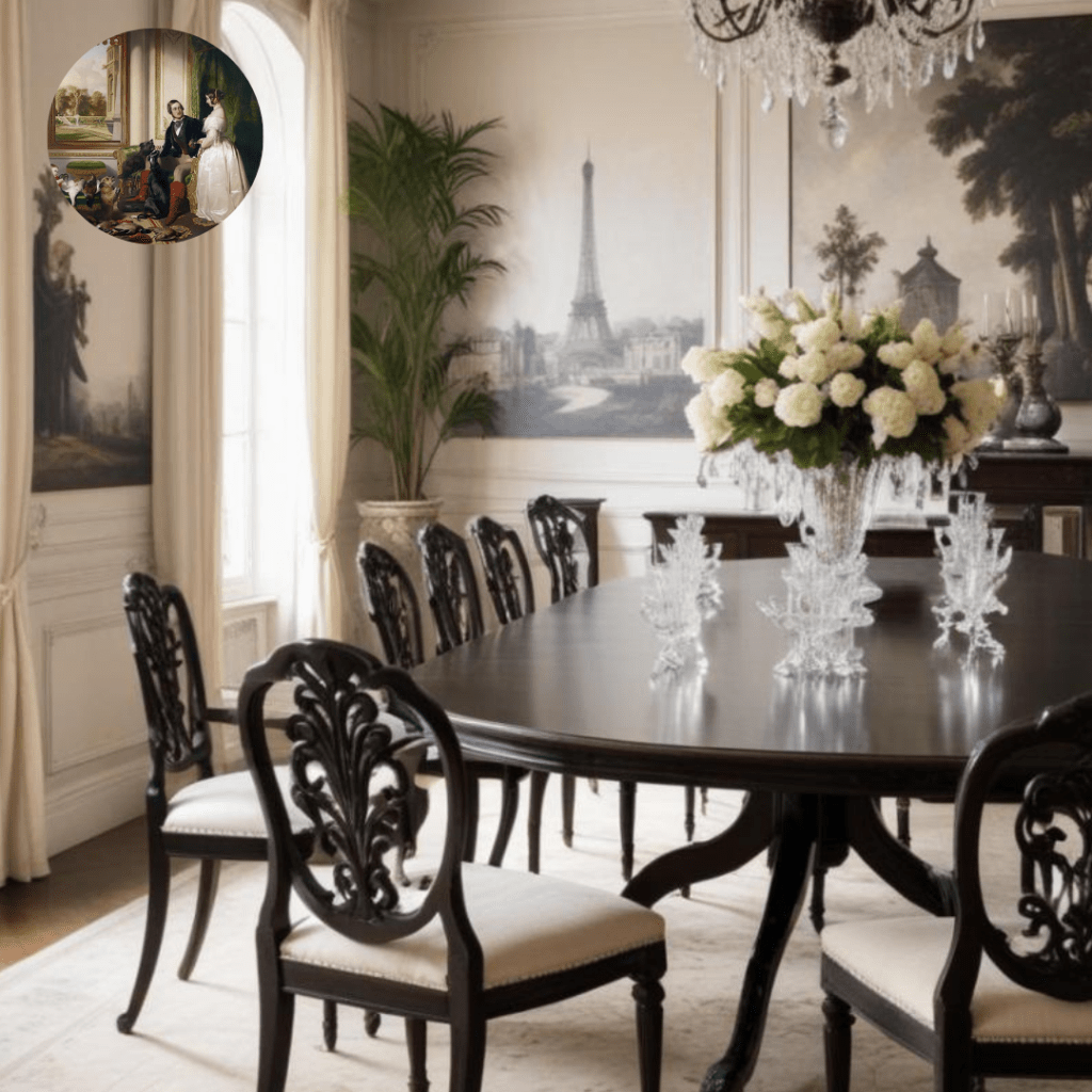 Queen Victoria’s deep love for Prince Albert was reflected in the lavish Victorian interiors of the 19th century. A grand dining room with intricate woodwork, a classic chandelier, and dramatic black-and-white muraled walls encapsulates the era’s rich decor. Dark wood furniture, heavy drapery, and elegant patterns set the stage for a romantic candlelit dinner. Get the Look Here