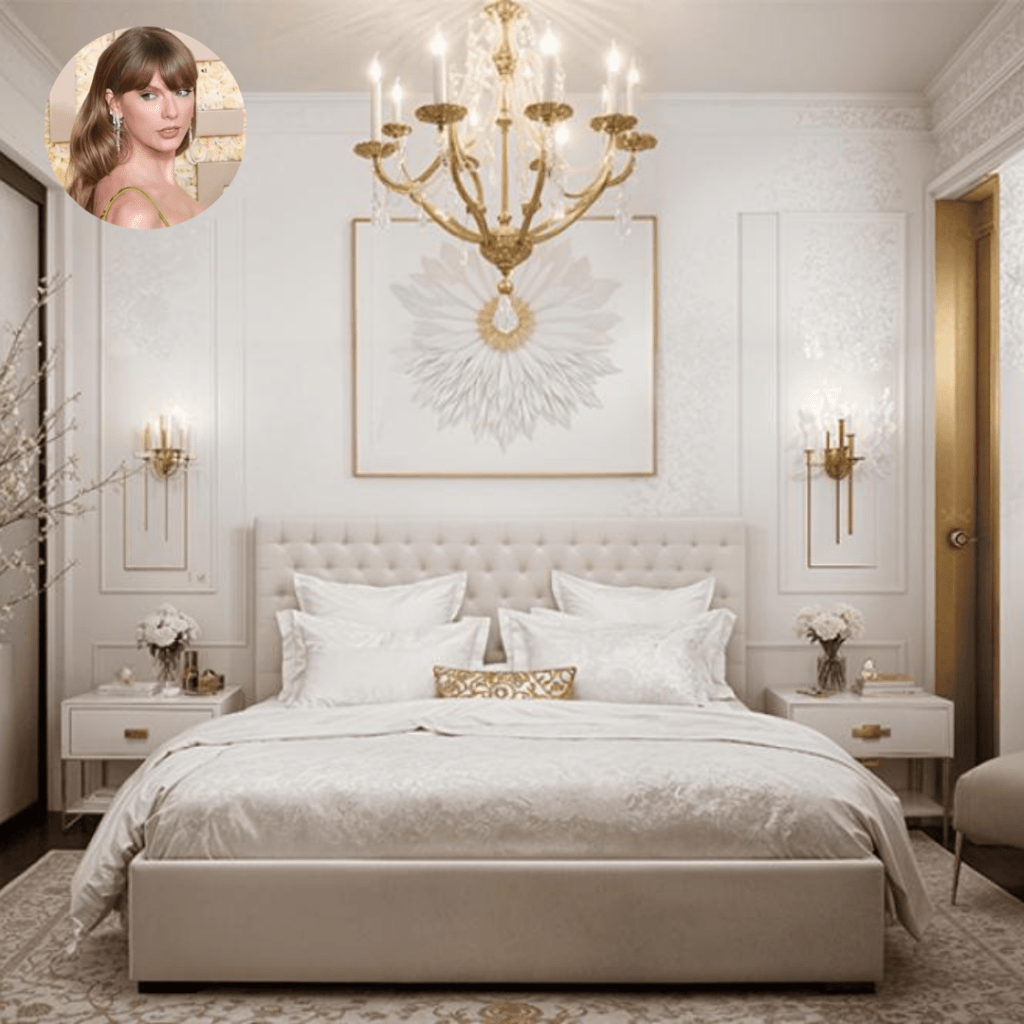 A power couple blending music, sports, and modern luxury deserves an equally stylish space. A contemporary bedroom with sleek furniture, metallic accents, and bold artwork mirrors their high-profile lifestyle. Soft textures like velvet and cashmere paired with a statement chandelier bring a touch of glamour. Gold, black, and deep jewel tones make for a dramatic yet sophisticated setting. Get the Look Here