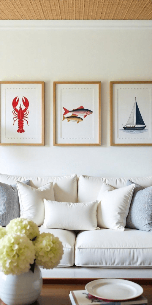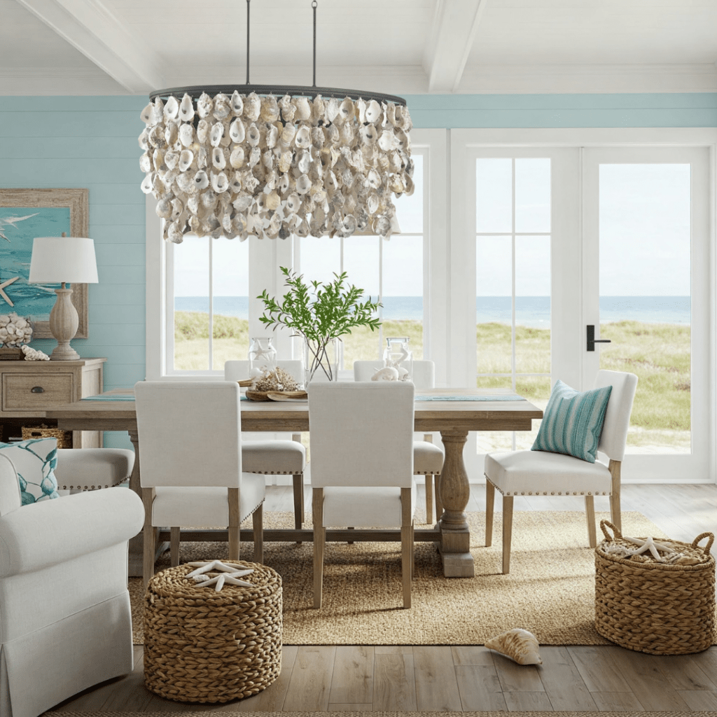 From weathered driftwood to vintage compasses, nautical elements tie the look together without going overboard. Think subtle accents—a bowl of sea glass, a lobster-print throw pillow, or an oyster shell mirror to add charm and coastal character.