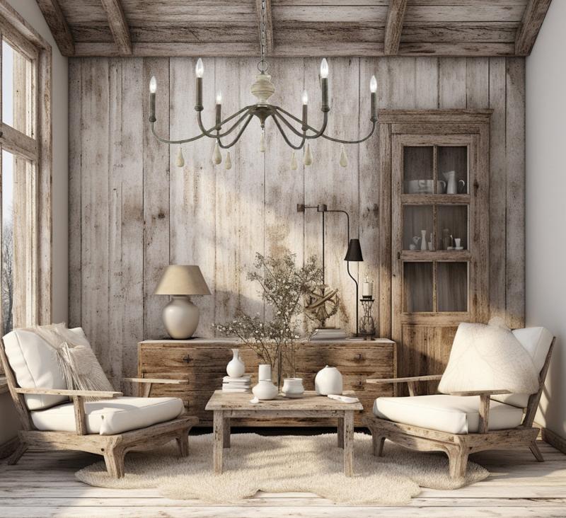 Style your own retreat with a reclaimed wood coffee table, Wood Platform Lounge Chair, and a Farmhouse Iron Chandelier from Pin the Look or Belle Escape. Add a Rustic Gray Concrete Table Lamp and dried wildflowers in a simple clay vase to bring the space to life.