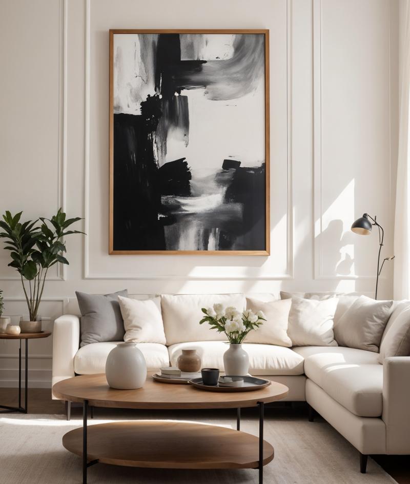 For the modern reader who thrives on balance and simplicity, this space is all about quiet sophistication. Picture a soft cream sectional sofa from Pin the Look, grounded by a round oak coffee table and styled with neutral ceramics that bring warmth without clutter. A black abstract wall art piece adds visual interest, tying in beautifully with a bronze floor lamp and charcoal accent cushions.